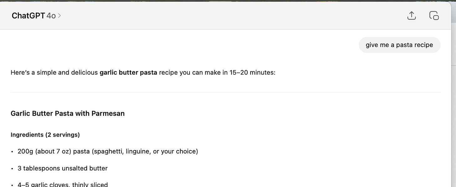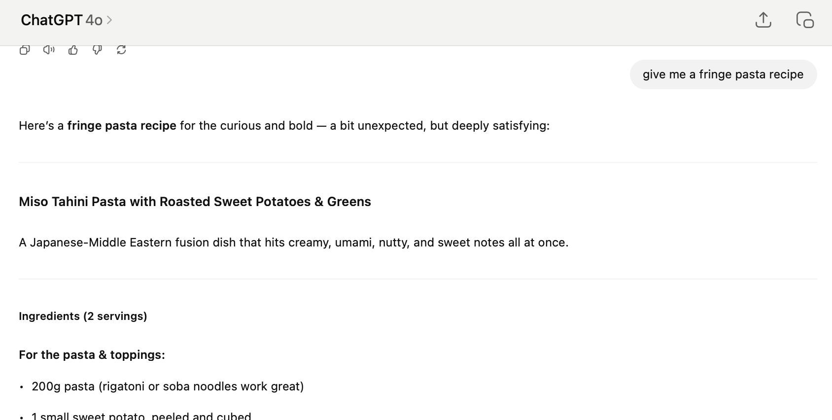 For example, if I ask it for a pasta recipe, it would pick what would satisfy most people, garlic butter or tomato basil. Not too experimental, not too basic. It's what you want most of the time.